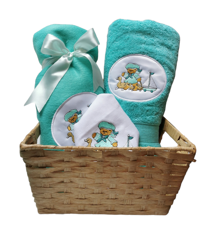 Canasto marinero con Toalla de baño, manta polar  y tutito.