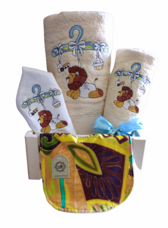 Toalla de baño y mano, babero y pañal tuto. Además todo personalizado con un nombre pequeño bordado. Cajita de madera y envoltura para regalo.