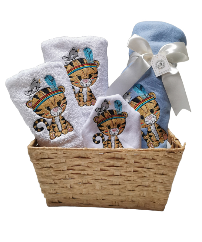 Canasto con Toalla de baño, mano y tuto color blanco bordado y manta polar bordada. Todo personalizado con un nombre pequeño bordado. Incluye Canasto y envoltura para regalo, especial y delicado Regalo por ejemplo para bebé