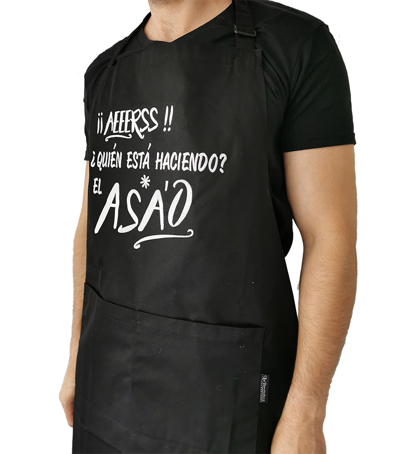 Pechera Negra de Gabardina con bolsillo . Además con diseño leyenda grande Bordada en el pecho . Tamaño único. Medidas de la pechera  Ancho : 62 cm mas tirantes y  Alto : 83 cm mas tirante. Tirante ajustable y con clip. Leyendas simpáticas y creativas para todos los gustos. La Pechera es un Regalo especial para los amantes de la cocina y la parrilla.