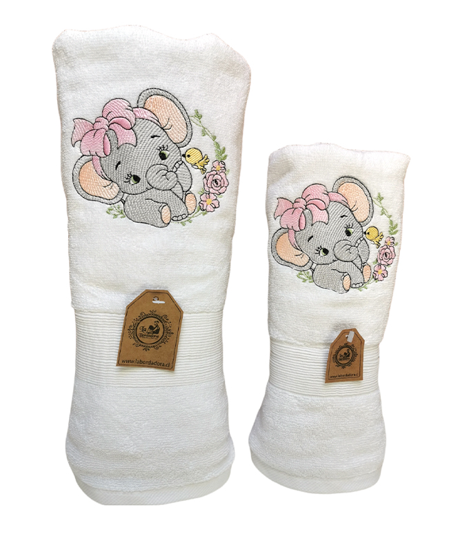 Toallas blancas de Mano y Baño con diseño elefante rosado